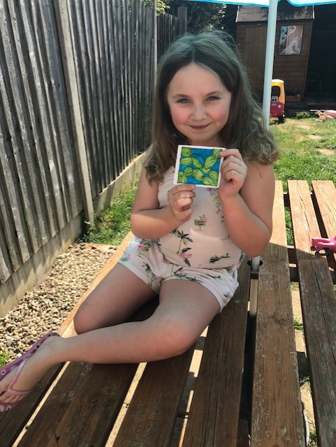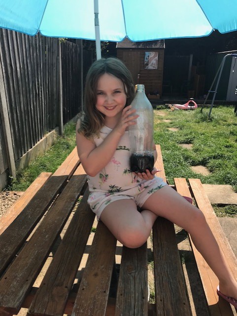 Here are the pictures that I told you about. The picture of me holding a bottle is pumpkin seed’s I have been growing over the past few weeks. I have been sewing so I have made a little bag and little pillows. I have built a little box that I made for my flowers and I have painted the box and my Wendy house the same colour. I have completed my art work and all my maths, also my science there was no strange noises they were just normal.
