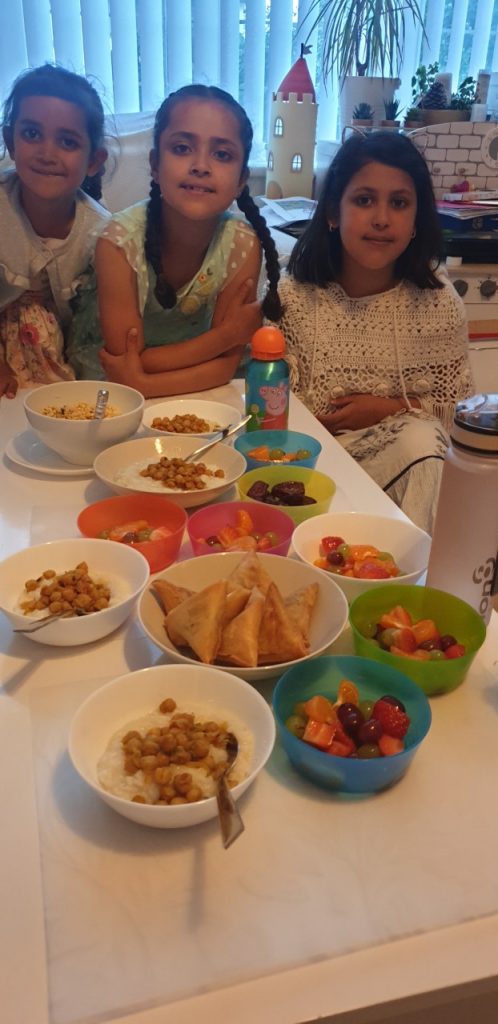 For the first time this year I fasted with my parents for a whole day and have now done two days of Ramadan. We wake up in the night just before sunrise to eat our food to eat our food then we go back to sleep after we pray. I usually wake up quite late and then do some home schooling and play with my sisters in the garden. I like to keep busy that way my day goes past fast. Then I help my mum and dad prepare food at around 8pm, my sisters help to get the table ready and we set the delicious food on the table.